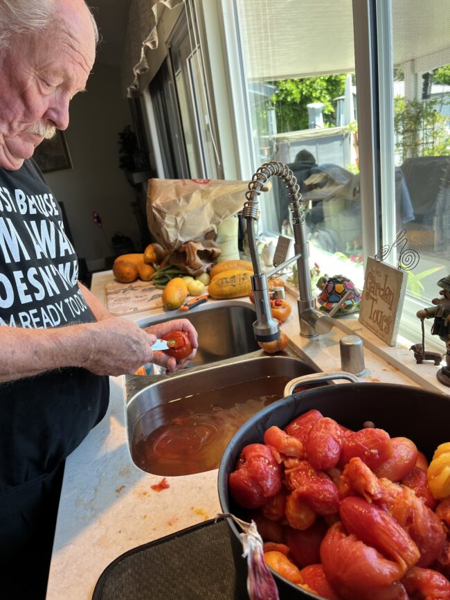 Mary decided to use some of the tomatoes. We washed and skinned them, added onions, basil, and garlic, and cooked them to make a great sauce. While Mary par-boiled the tomatoes and dropped them into a bowl of cold water, I would remove them and remove the skins; we had an assembly line going.