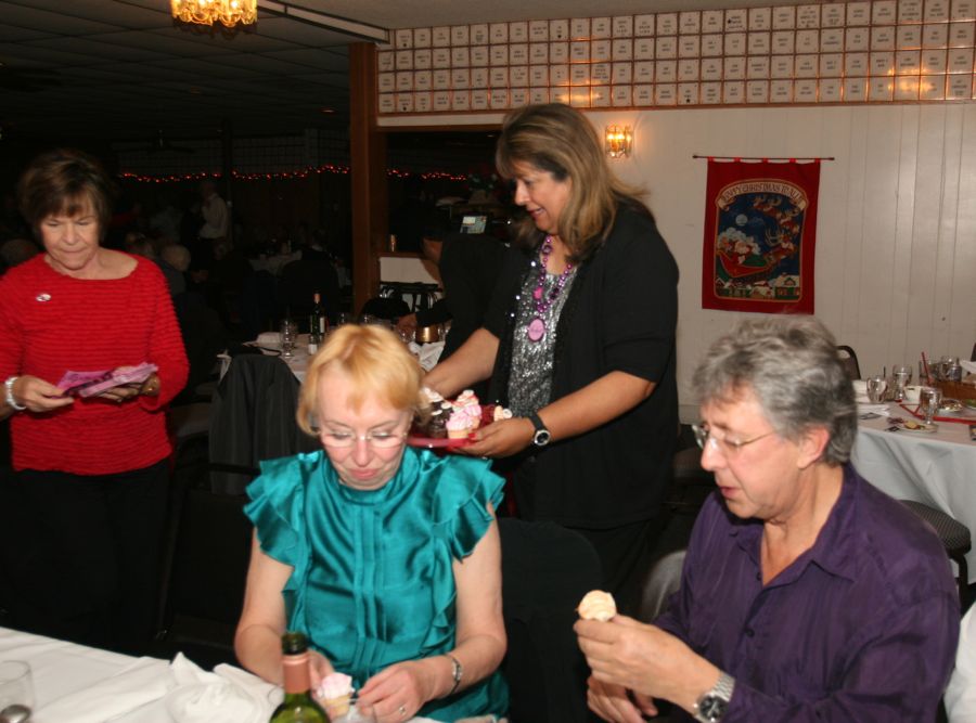 Vicky and Kathy set up the cake