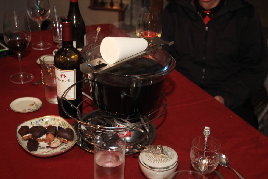 Did You Know? - Feuerzangenbowle is prepared in a bowl, similar to a fondue set, which usually is suspended over a small burner (rechaud). The bowl is filled with heated dry red wine spiced with cinnamon sticks, cloves, star anise and orange peel, similar to mulled wine. The Feuerzange was originally a pair of tongs, but nowadays it is common for a purpose-designed metal grate mounted on top of the bowl to hold the Zuckerhut (sugarloaf or literally "sugar hat"), a sugar cone around seven inches long.