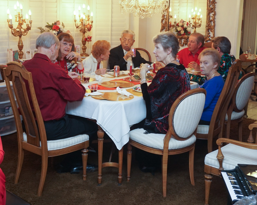 Jan, with the help of her little Elves, Sam and Brenda, put on a spectacular Christmas Party this evening. Friends from the Phoenix Club gathered together and dined on a potpourri of delectable dishes. And for the end of the meal, we had desserts. We are talking serious desserts! Homemade key-lime pie, Pecan pie,