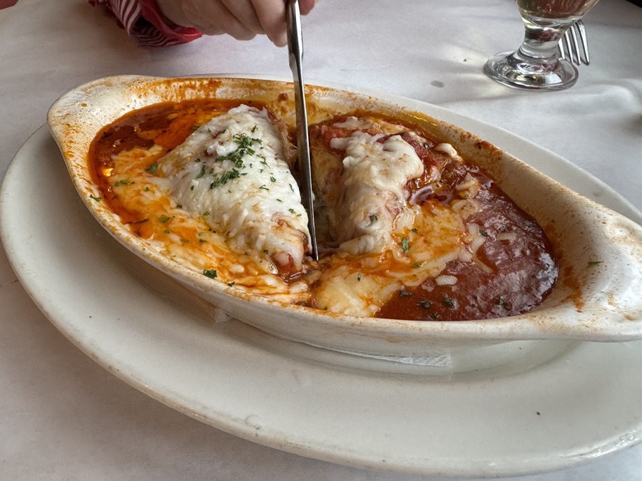 We began our meal with an order of bruschetta, followed by various salads. We then shared a delectable meat lasagne and enjoyed a glass of wine. As we neared the end of our dinner, we decided to call Jeff, our neighbor, to see if he would like to join us for a meal. He ordered a lasagne for himself as well.
