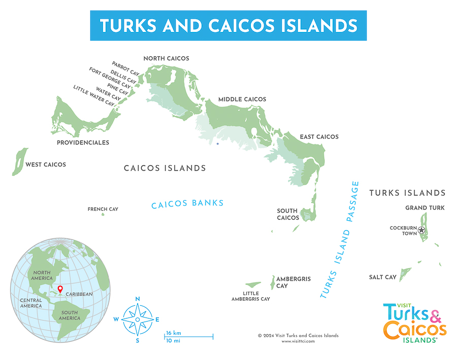 Turks and Caicos is an archipelago of 40 low-lying coral islands in the Atlantic Ocean, a British Overseas Territory southeast of the Bahamas. The gateway island of Providenciales, known as Provo, is home to expansive Grace Bay Beach, with luxury resorts, shops and restaurants. Scuba-diving sites include a 14-mile barrier reef on Provo's north shore and a dramatic 2,134m underwater wall off Grand Turk island.