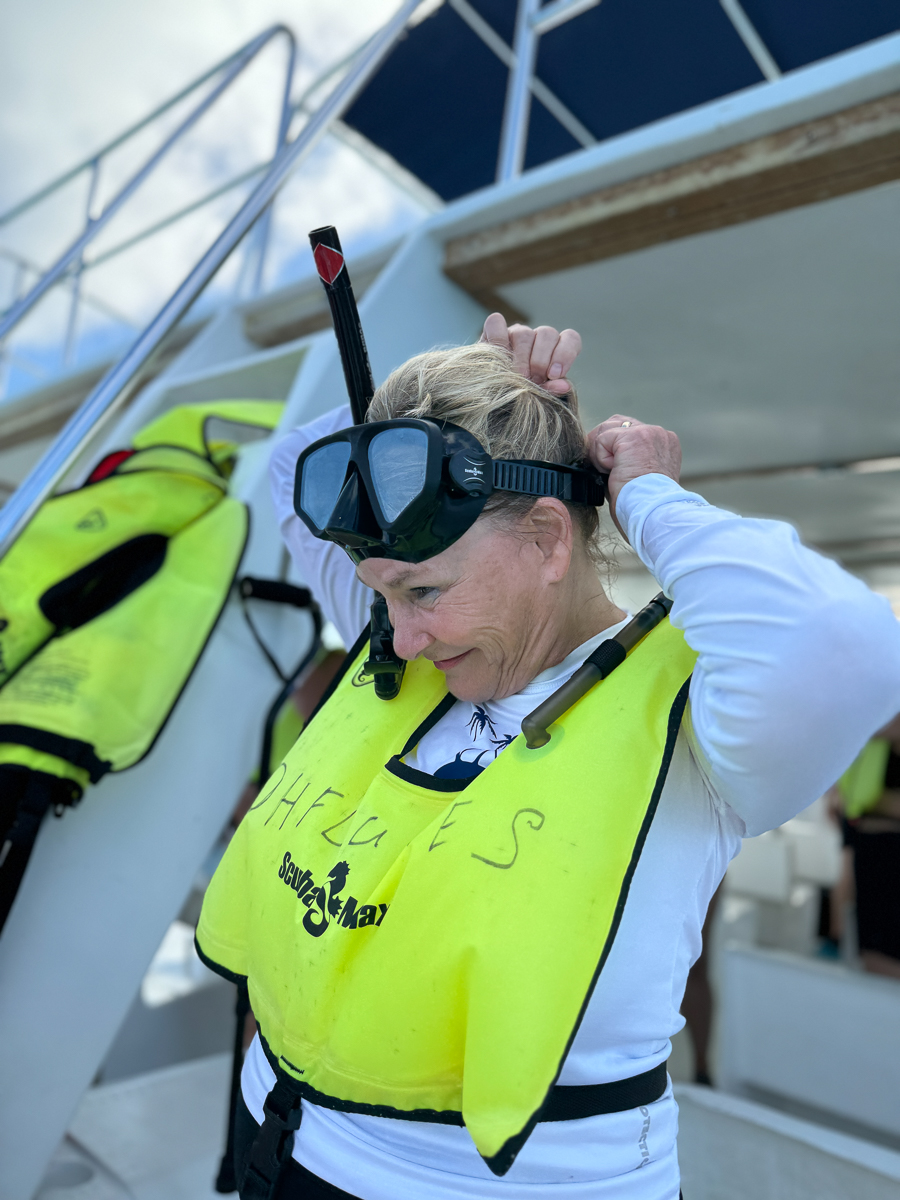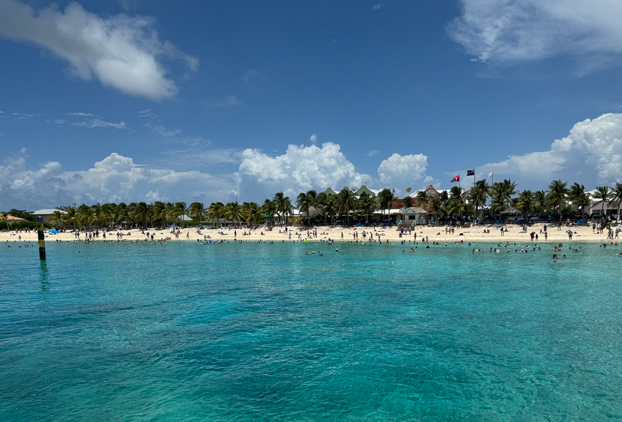 We helped with the answers and then decided to prepare for the snorkeling adventure. We moved right into the beach area and walked off the ship. We were going to go shopping for a UV shirt for Mary.