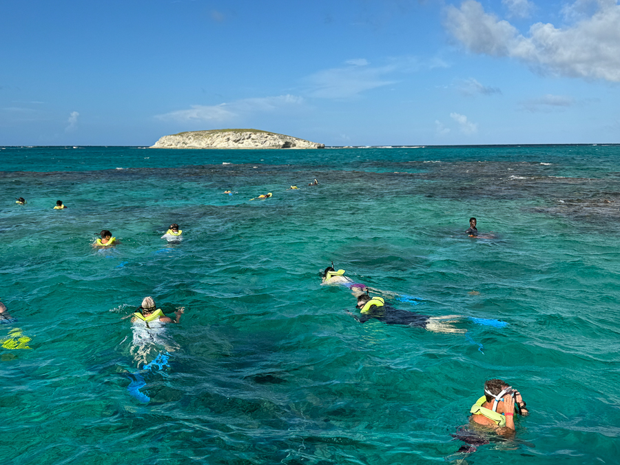 Now we walk to the boats carrying us to the snorkeling boats. After a relatively long walk through the beach sand, I was huffing and puffing when we arrived. We hopped on the boat and sped off for a fifteen-minute trip to the island's reefs.