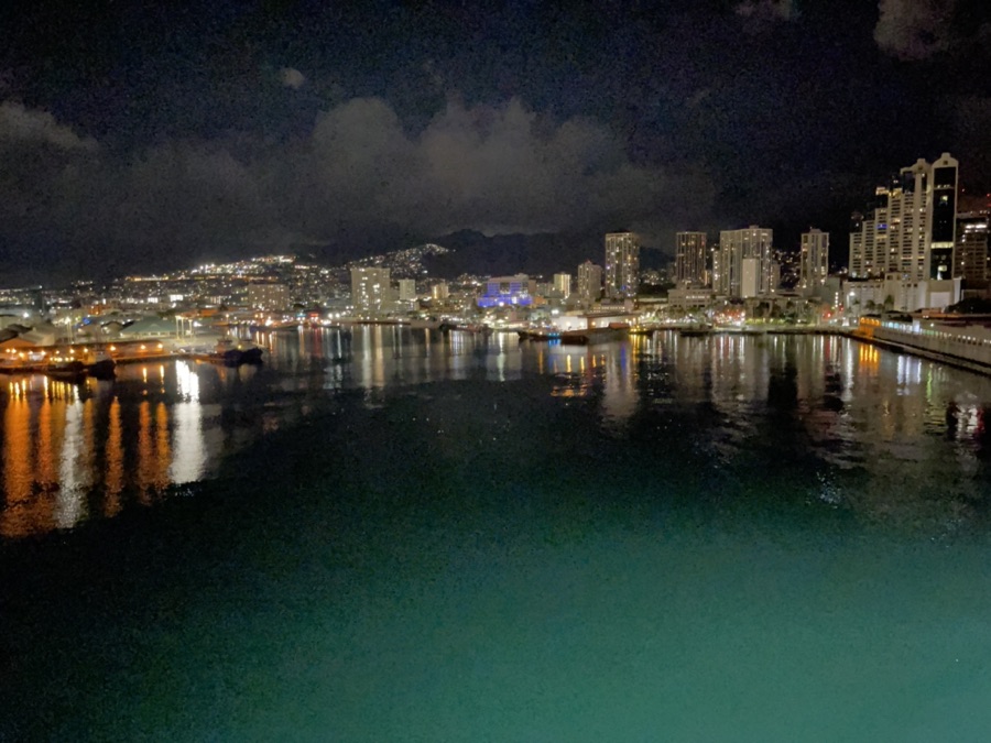 We departed at11:00 pm according to the Aloha Tower which was painted in red lights this evening.