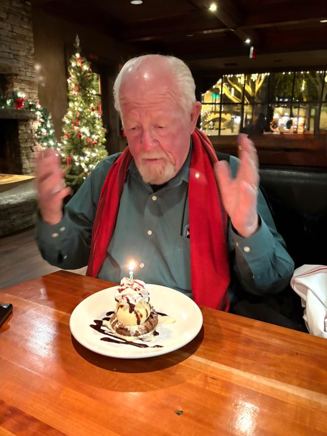 Mary and I (dressed as the Grinch) thought we saw a fire in the Christmas tree. (It was a dream!)[/caption] We had a nice breakfast, then got ready for today's journey. I thought a lot about today being my 81st year on this planet.
