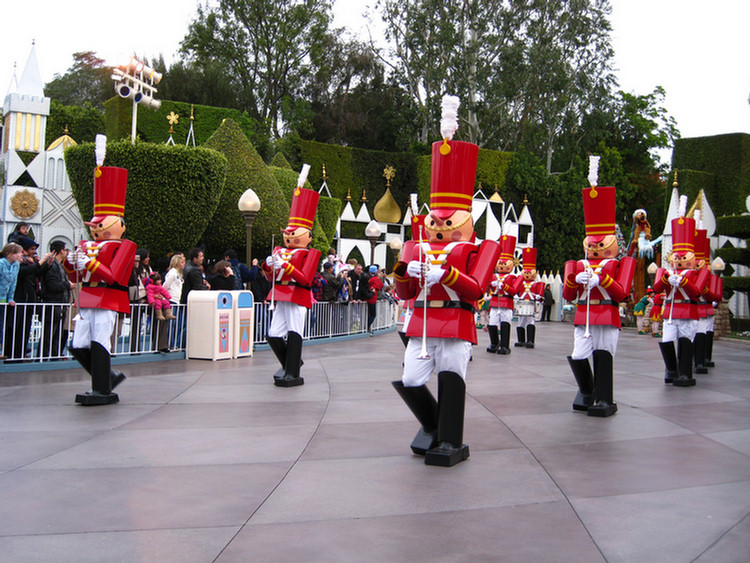 During the holiday season (first week of November through first week of January) it's a small world is transformed into a holiday fantasy. The outside of the building, including all of the topiary animals, are decorated with white lights and the clock face wears a Santa hat. Inside the building it seems like everyone and everything is in the holiday spirit. There are signs proclaiming "Happy Holidays", "Merry Christmas", and "Happy New Year" in many different languages, holiday and fireworks displays, and everyone is dressed in their holiday best. The animals get into the spirit of the season, too -- there's a number of reindeer with red noses, and the kiwi birds have jingle bells on their beaks. Even the soundtrack has a holiday flavor -- for most of the ride it alternates verses of "it's a small world" with Jingle Bells. Be sure and listen as you pass by the mermaids, though, since they sing their own version: Jingle *Shells*. In the "White" room everyone joins together in a chorus of Deck the Halls.