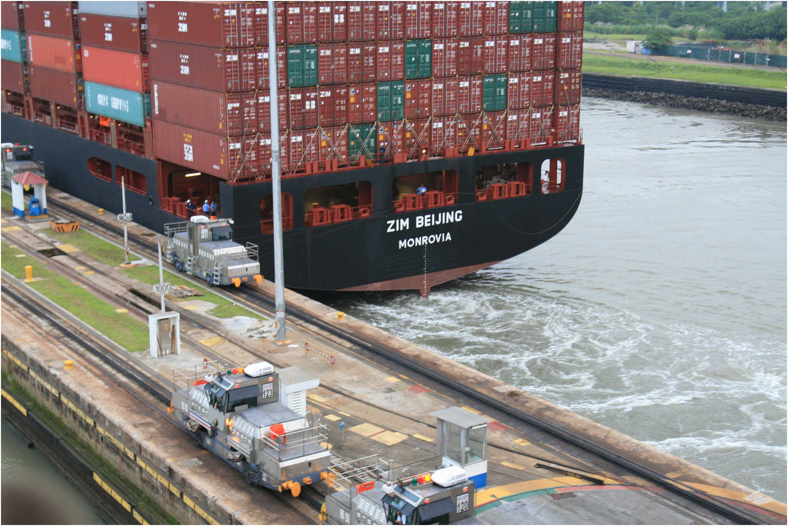 In the Miraflores locks, vessels are lifted (or lowered) in three stages totaling 8 m, allowing them to transit to or from the Pacific Ocean port of Balboa (near Panama City).
