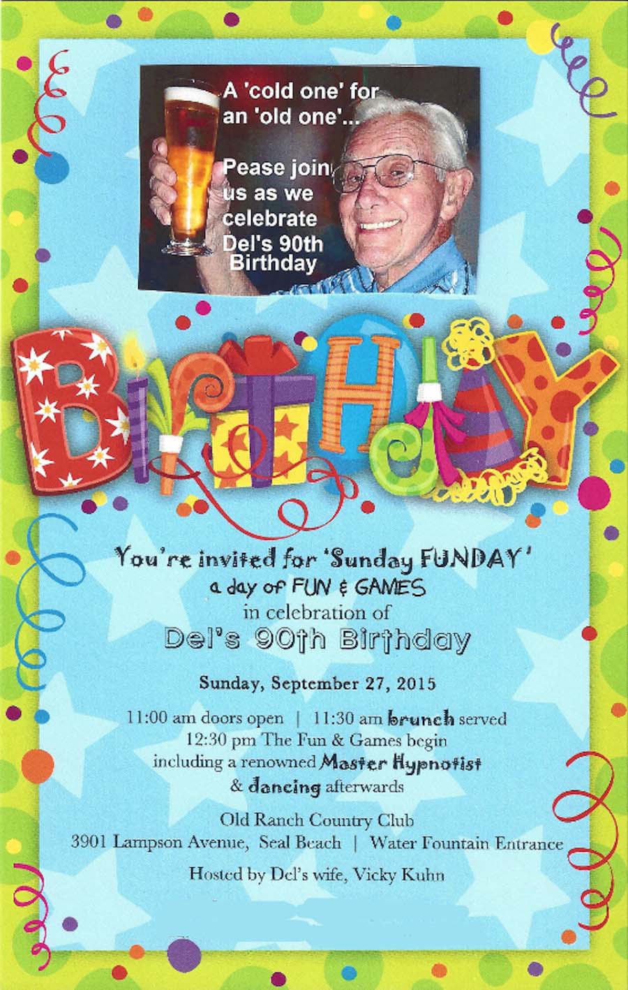 It's that time! Time to celebrate a wonderful neighbor and dear friends 90th year on the planet! We are at Old Ranch Country Club and Vicky has again out done herself! Join the family and friends!